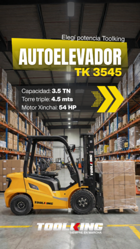 El autoelevador Toolking TK 3545 es la solución ideal para operaciones que requieren agilidad y fuerza. Con una capacidad de 2.5 toneladas y una torre triple de gran alcance, este equipo está diseñado para optimizar el espacio en depósitos y facilitar las tareas de carga y descarga en cualquier entorno industrial o agrícola.
